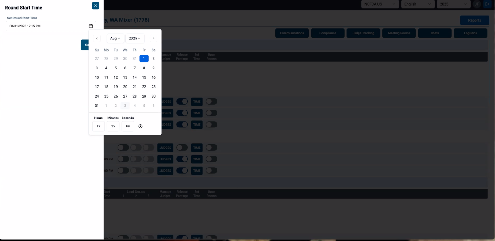 - NM will send text & notification to competitors with the start time and whether rooms are open or opening shortly. Use appropriate Notification templates.