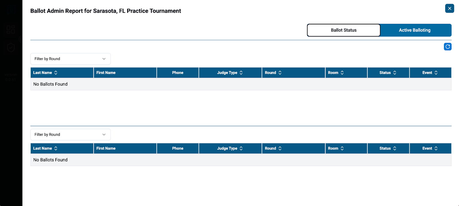 You can filter the report by round.  Under “Status” you will see if a ballot is “Not Started,” meaning the ballot has not been opened by the judge or “In Progress” or “Complete.”