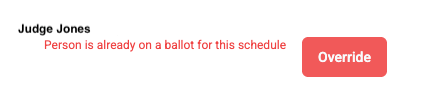 When adding a judge you may encounter an override message (see image below for an example). Please confirm with the RC before adding a judge with an override message.