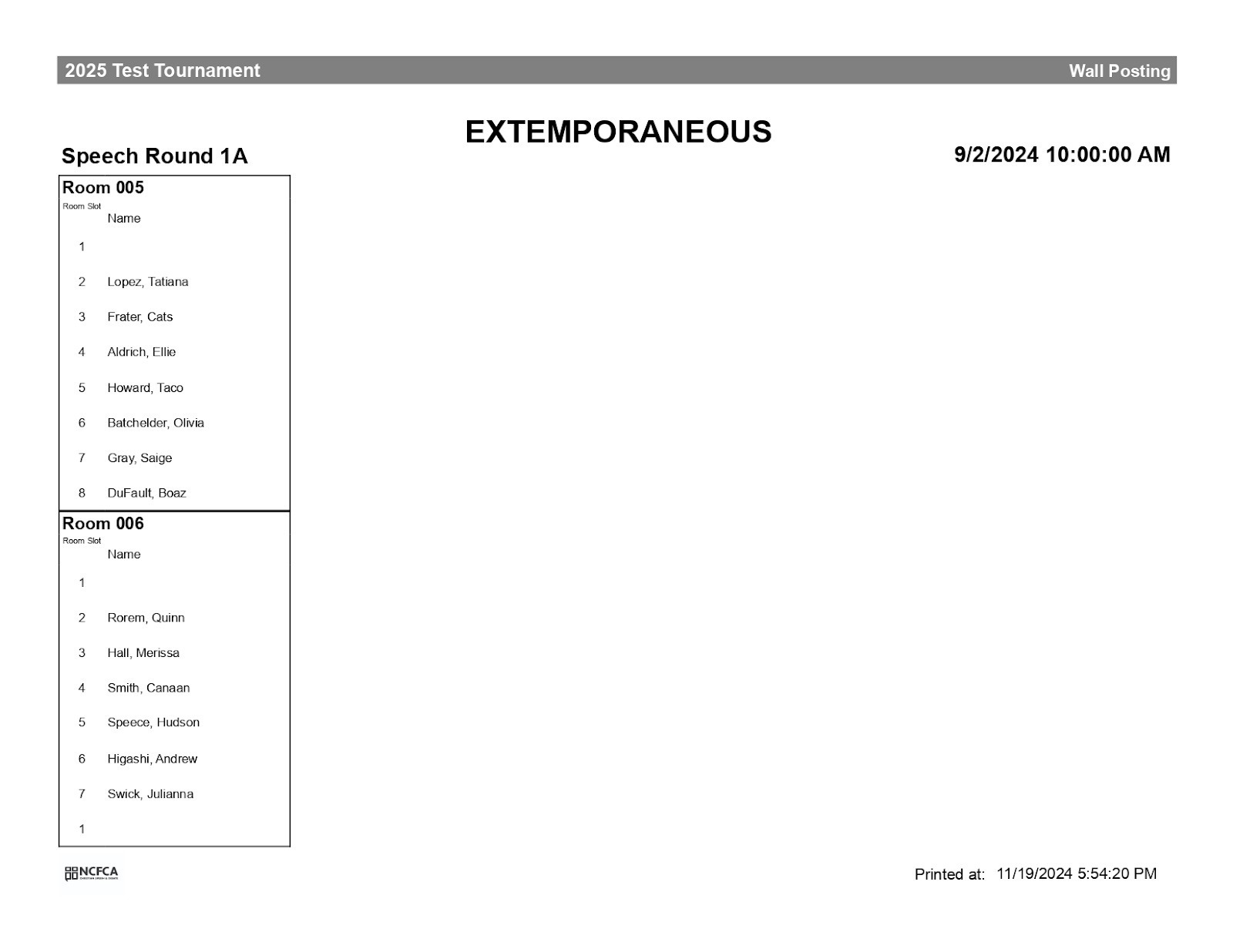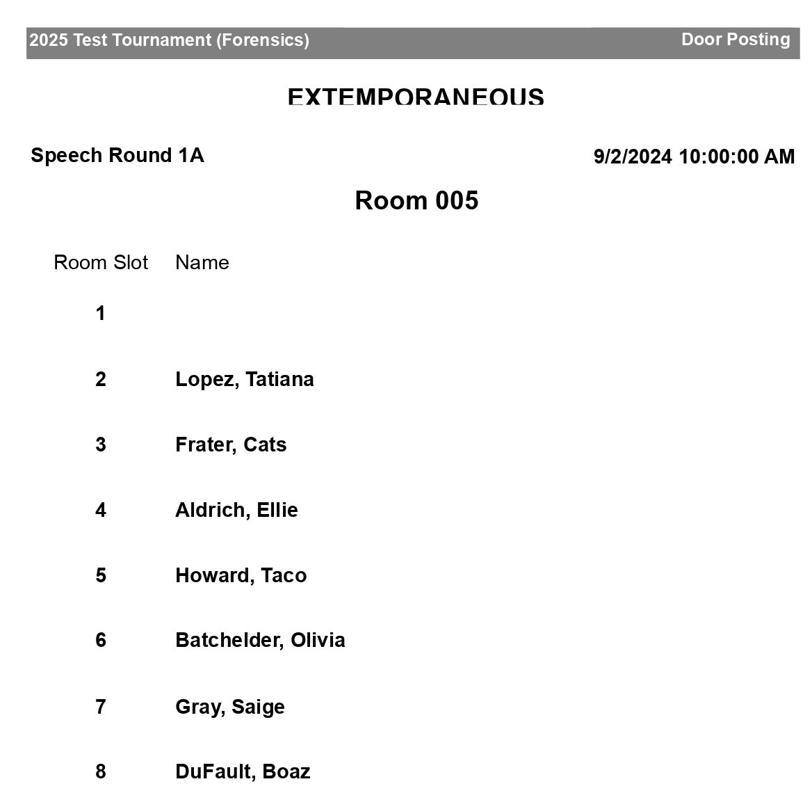 Room Slot reflects the speaking window where they will actually present their speech. When the Speaker times sheet is ready from Tab, the Draw Time and Speaking Times will be provided. The first speaker will be prepping 5 minutes before and through the first room slot. Therefore, no speaker is speaking in Room Slot 1 for Extemp.