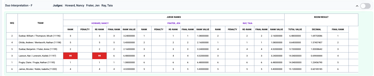 - First confirm that all final ranks from a given judge are unique (i.e., there are no duplicates). Acceptable exceptions to this may occur if there are multiple DNCs in the same room.