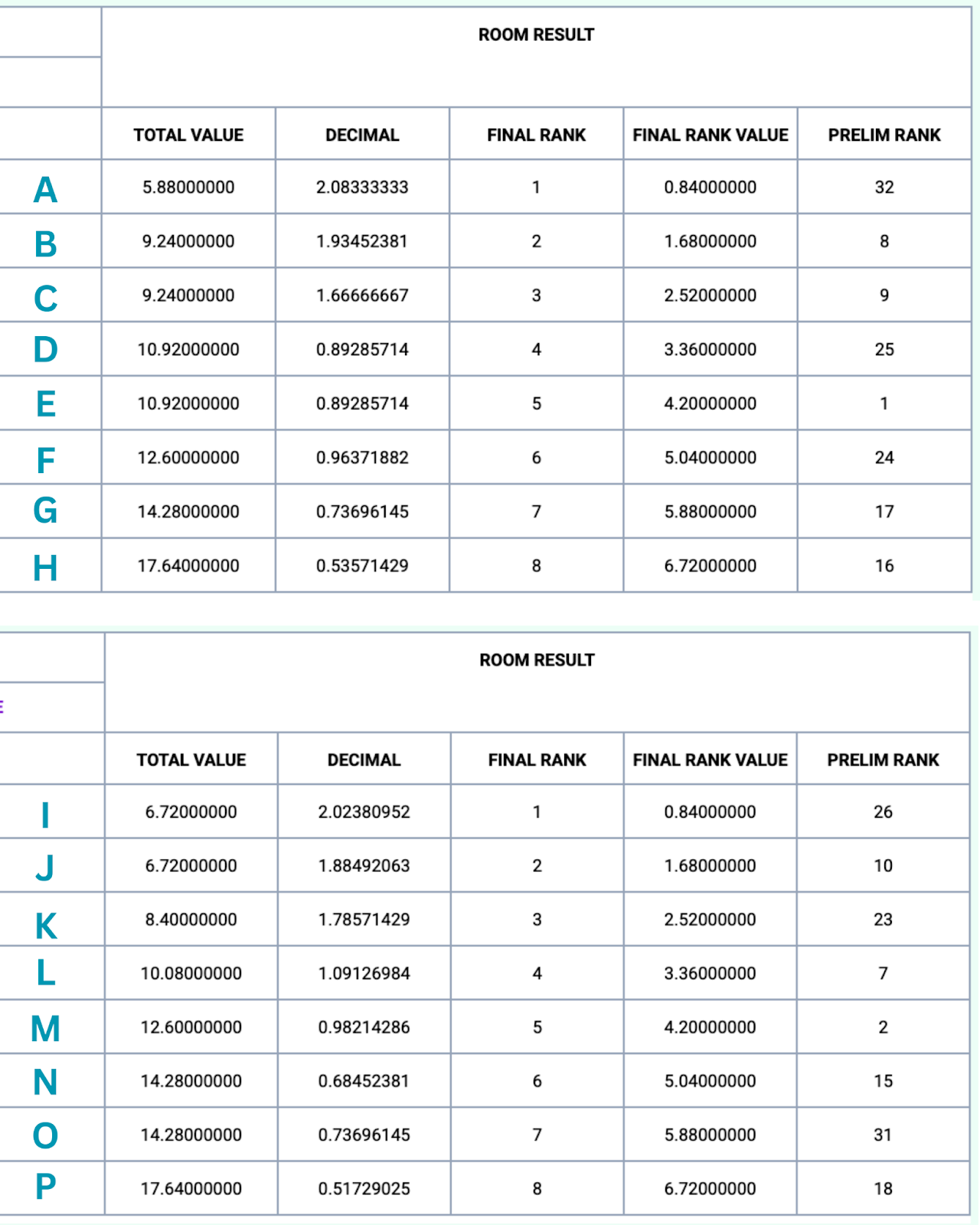 - SemiFinalists are ordered by room rank. A SemiFinal round has two of each rank (two 5th places, two 6th places, etc.), one from each room. (For modified SemiFinals, there will be four of each rank.) The preliminary ranking is used to break the tie between those of the same room ranks. The competitor with the better preliminary rank receives the better final ranking.
